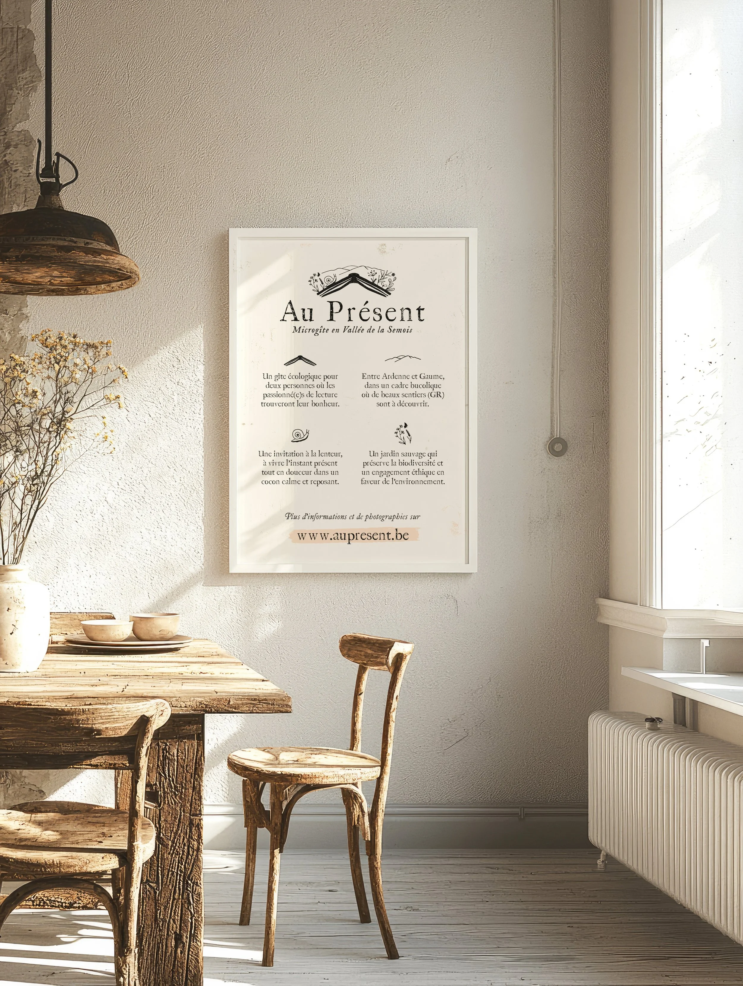 Au Présent est un petit studio pour deux personnes situé dans la Vallée de la Semois au cœur l'Ardenne, région wallonne en Belgique. Un cadre enchanteur où le repos, la déconnexion, la lecture, le jardin ou encore la randonnée dans la campagne environnante sont de mise. C’est un lieu qui allie à la fois douceur et militantisme envers la protection de l’environnement.